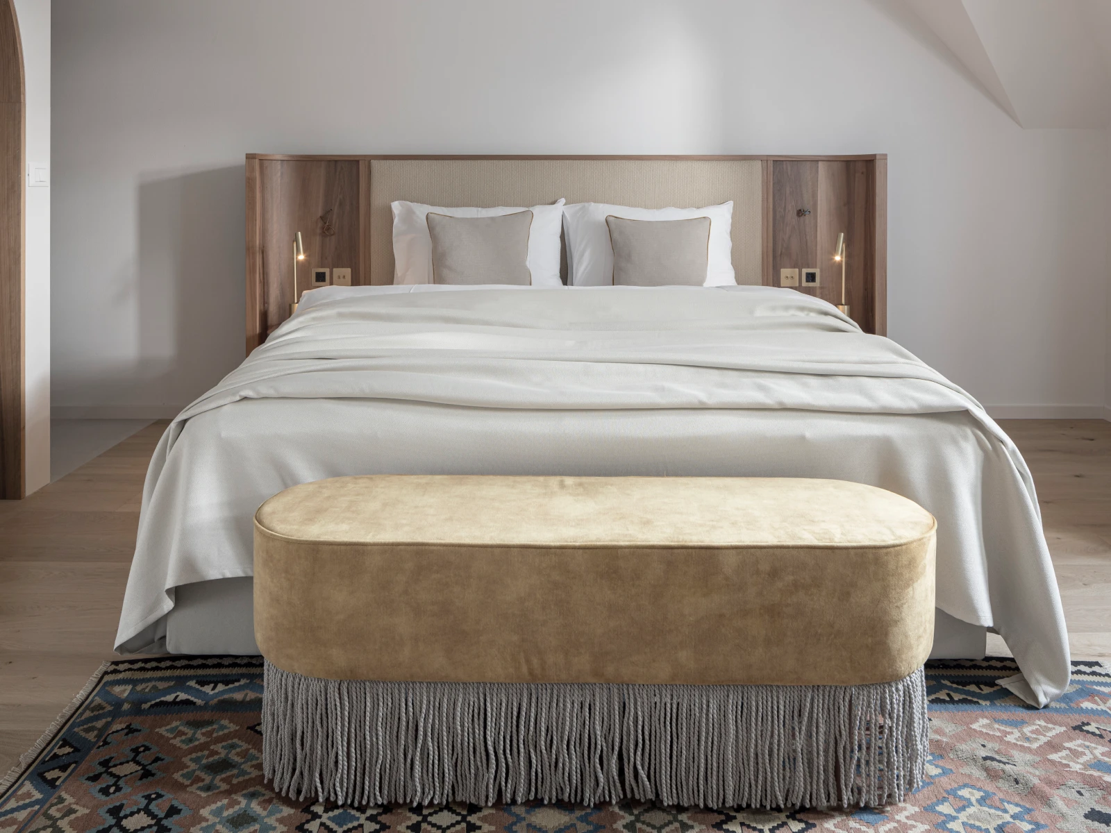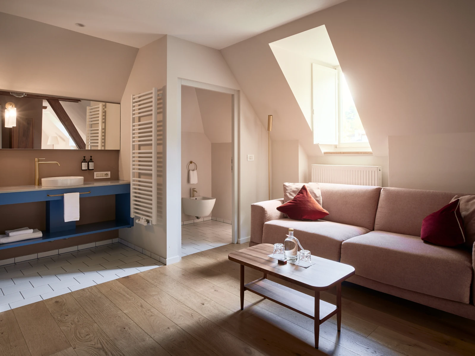 from 98 € per night44 sqm attic suite with two separate areas, accommodating up to 4 guests. Guests have a living area with sofa bed, a bedroom with king-size double bed and Simmons mattress, bathroom with shower and separate toilet with bidet, plus safe, air conditioning, minibar, kettle, coffee machine, bathrobes and slippers.