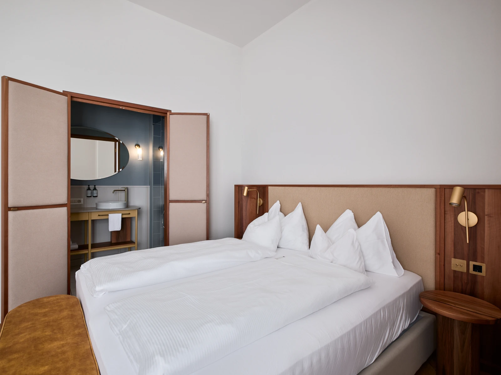 from 76 € per night34 sqm open-plan double rooms featuring a king-size bed with Simmons mattress, bathroom with shower and separate toilet with bidet, safe, minibar, kettle, coffee machine and air conditioning. Guests also have bathrobes and slippers at their disposal.